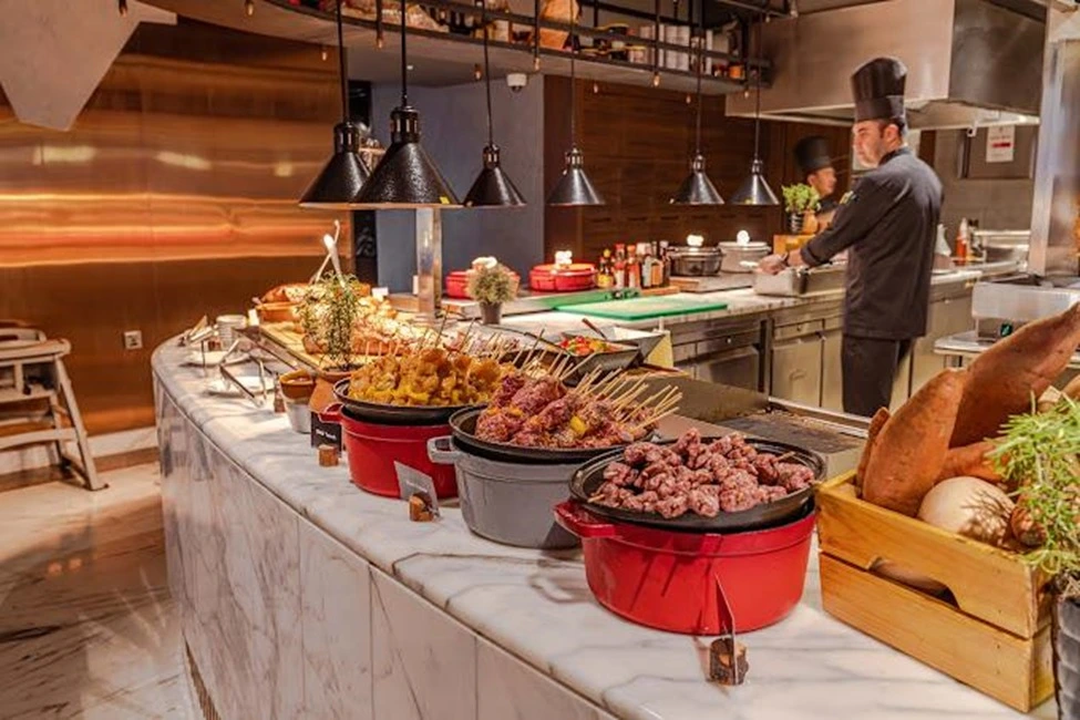 This restaurant offers a lavish buffet with a blend of Arabic and international cuisine, offering live stations with grills, sushi, pasta, and Qatari favorites.